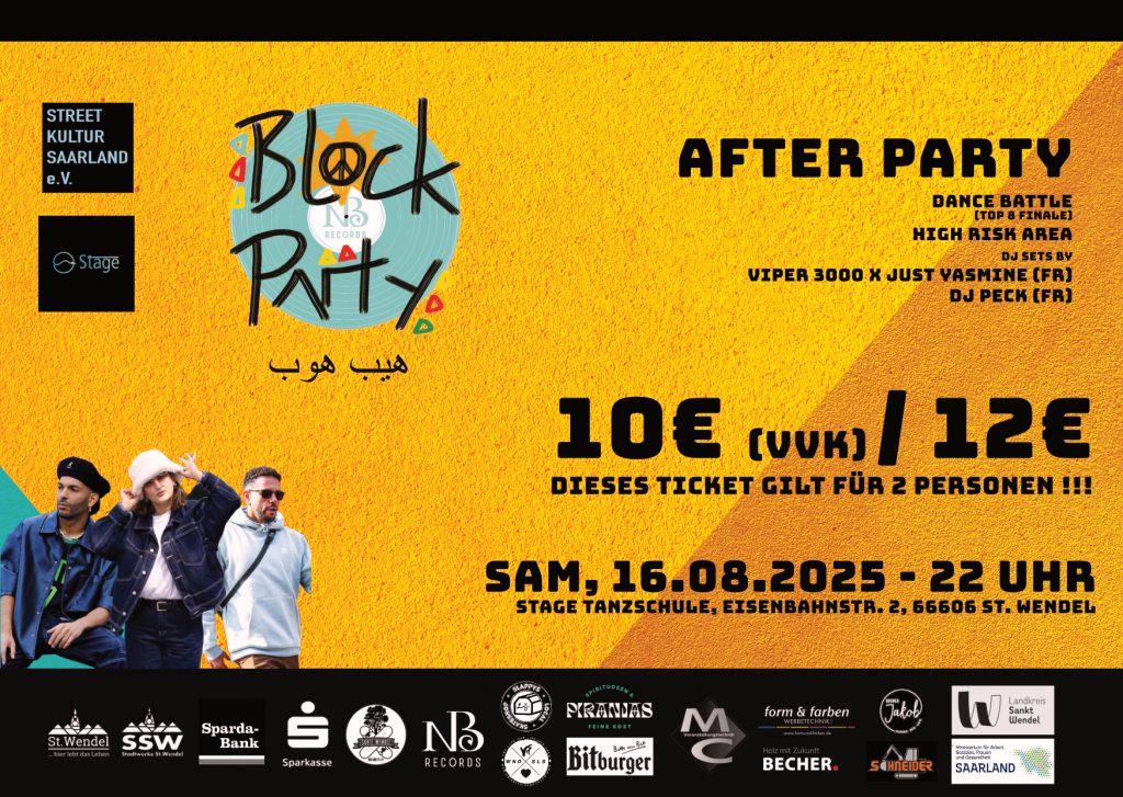 Was ist die Block Party?? Die Idee der Block Party ist das Zusammenbringen diverser Menschen bei guter Stimmung, leckerem Essen & origineller Live Musik. Das erste Internationale Hip Hop Festival in St. Wendel mit Live-Musik, Graffiti, Djs, Street Food, Street Wear, Tanz & Freiem Eintritt. Alle sind eingeladen über alle Sozialen Grenzen hinweg!
