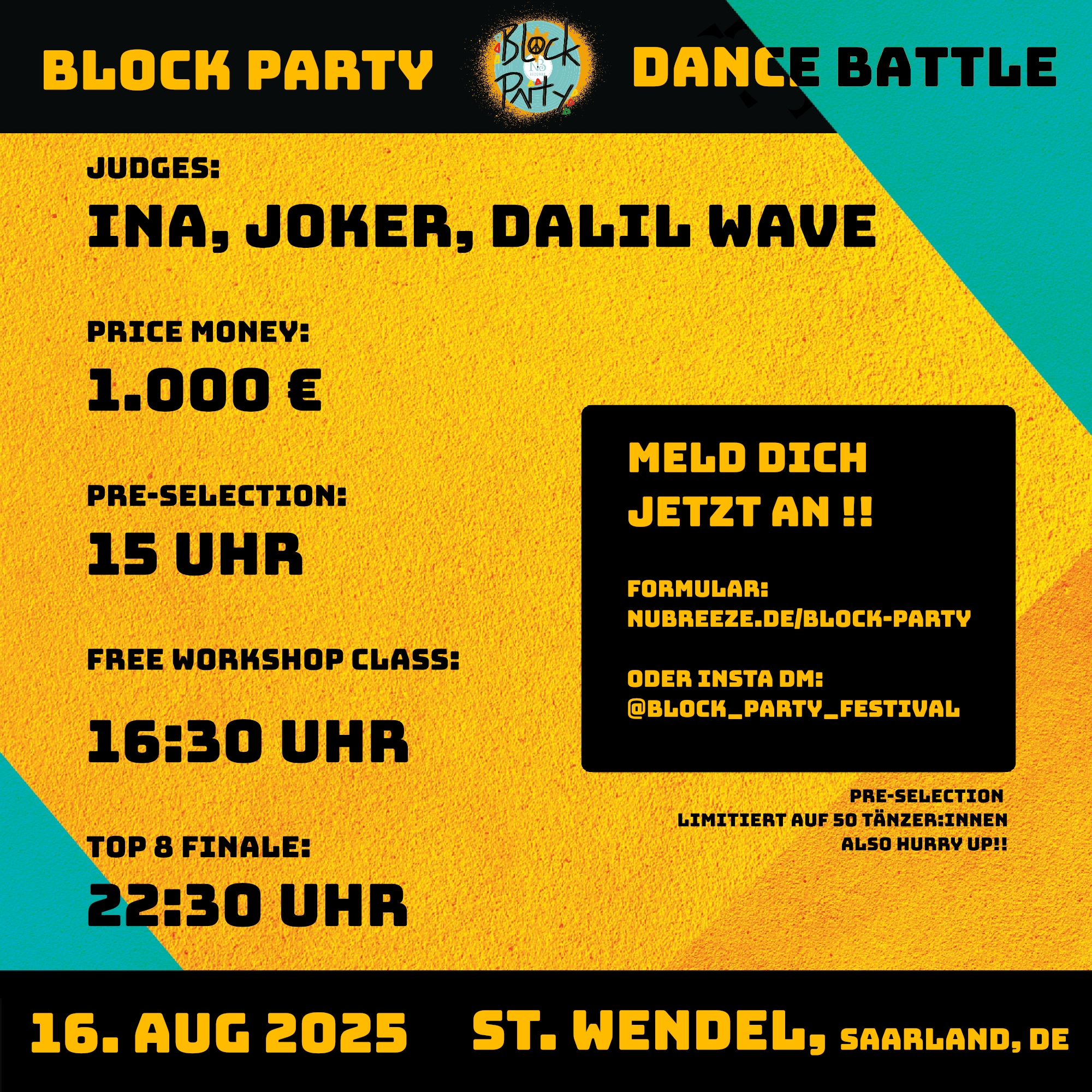 • Wie kann ich euch erreichen? Wir arbeiten gerade an ’ner WhatsApp Nummer. Bis dahin, gerne per Email an festival@nubreeze.de oder per Insta-DM an @block_Party_Festival